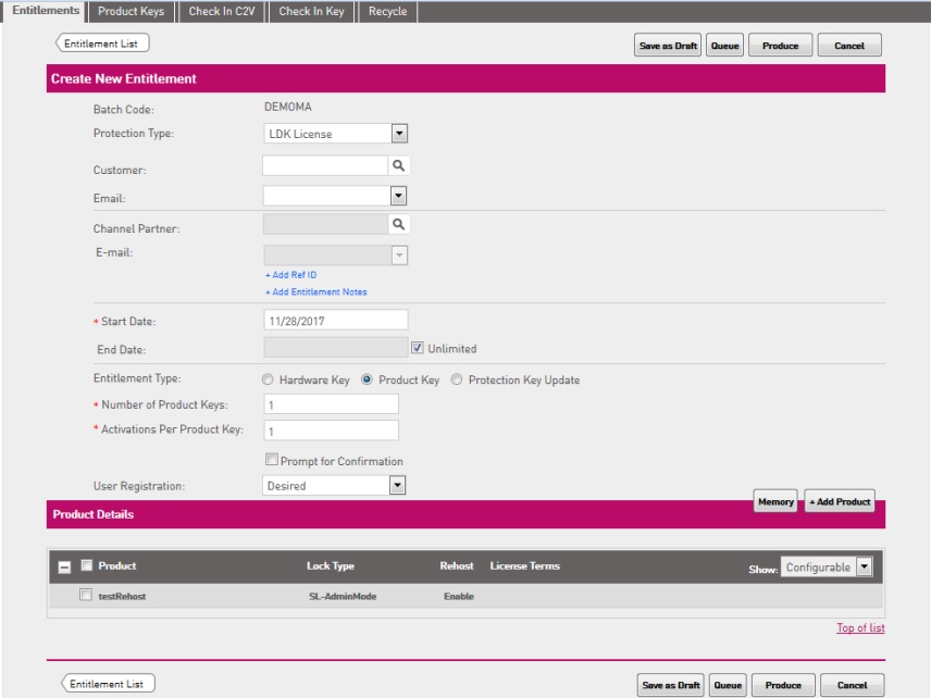 (c、 )去 EMS 里邊Entitlement 標簽頁下,像正常升級加密鎖一樣的標準步驟進行操作。新建 Entitlement,然后Entitlement type選擇中間的Product Key,添加上剛才定義的產品testRehost,然后點擊 Produce,接著 Activate。