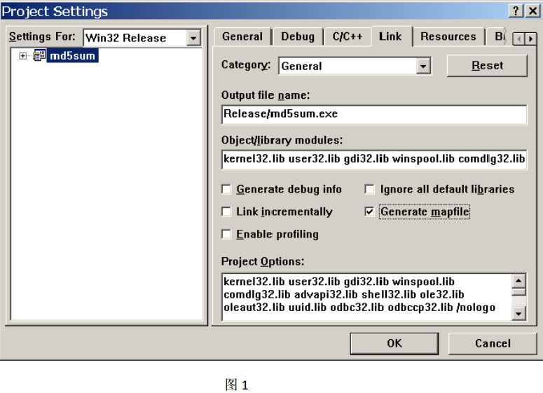使用 Microsoft Visual C++ 6.0 打開一個已有工程, 在菜單欄中選擇: Project——Settings,這將打開 Project Settings 對話框, 請選擇 Link 選項卡,勾選選項: “Generate mapfile”(如圖 1) , 點擊確定, 然后重新編譯整個工程, map 文件將與 exe 文件生成到同一目錄中。