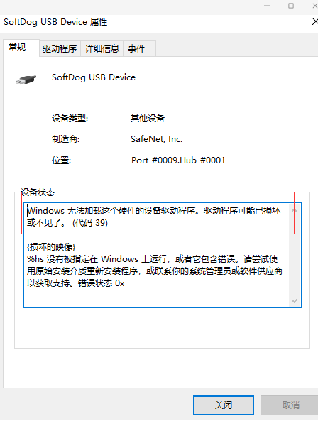 軟件狗、微狗和宏狗在win10環境中驅動安裝成功,但在設備管理器中查看帶嘆號,點擊帶嘆號的設備,詳細頁面中有39錯誤代碼,