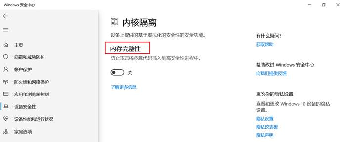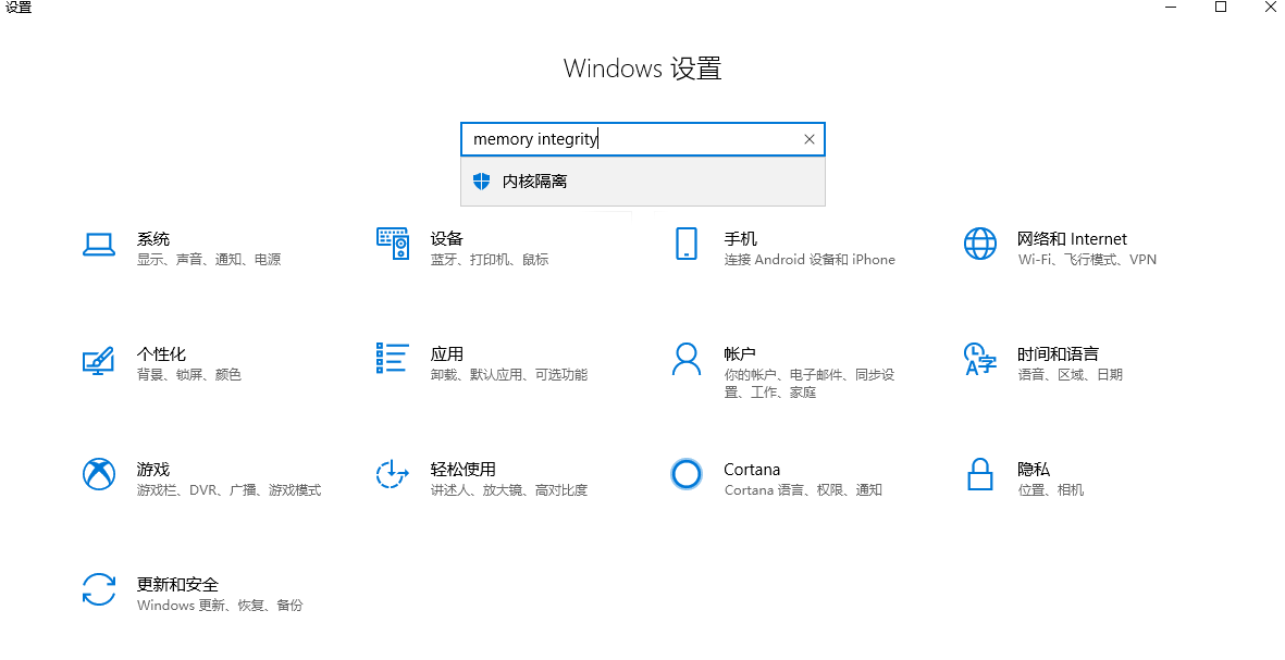 在win10的設置中,查找“memory integrity”或“內核隔離”,