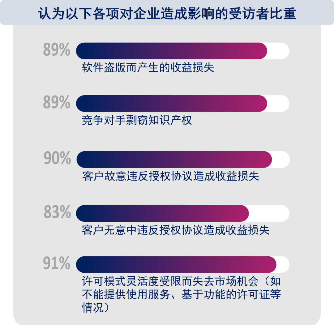 數(shù)字時代前進的步伐已勢如破竹,而軟件則承載著各大廠商的核心競爭力,軟件受到侵害,核心競爭力首當(dāng)其沖。據(jù)報告顯示,90%的廠商擔(dān)心軟件會遭到侵害,據(jù)估計,其中有超過四分之一的軟件未經(jīng)許可被濫用或盜用,導(dǎo)致效益、競爭力、業(yè)務(wù)機會等方面的利益受損。然而,維系客戶關(guān)系仍是軟件廠商未來長期收入的“黑馬”,如何在保護自身知識產(chǎn)權(quán)的同時還能夠打造可持續(xù)的業(yè)務(wù)收入模式,平衡二者關(guān)系成為了軟件廠商需要面對的挑戰(zhàn)。