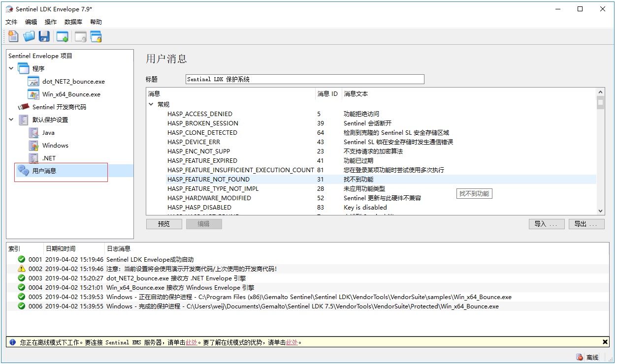 程序加密后運行時,會根據加密鎖的狀態出現彈窗(如沒有插加密鎖等),如果希望修改顯示的彈窗內容,可根據顯示的消息ID數值,找到對應的消息文件,修改后重新加密。