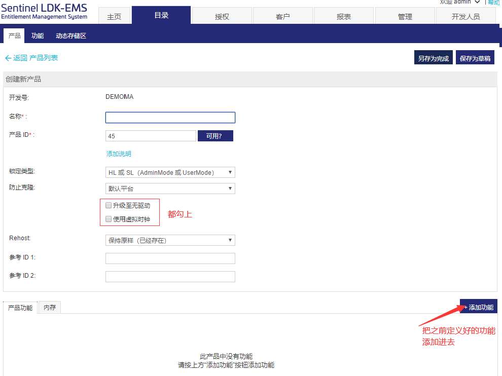 請按圖示步驟選擇1目錄,2產品,3開發號,4新建產品,其中開發號是對應5個字母的主鎖開發號,測試用戶請選擇DEMOMA