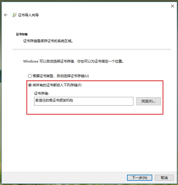 3、選擇“將所有證書放入以下存儲中(Place all Certificates in the following store)” > 點擊“瀏覽” > 選擇“受信任的根證書頒發(fā)機構(Trusted Root Certification Authorities)” > 點擊“確定” > 然后點擊“下一步”;